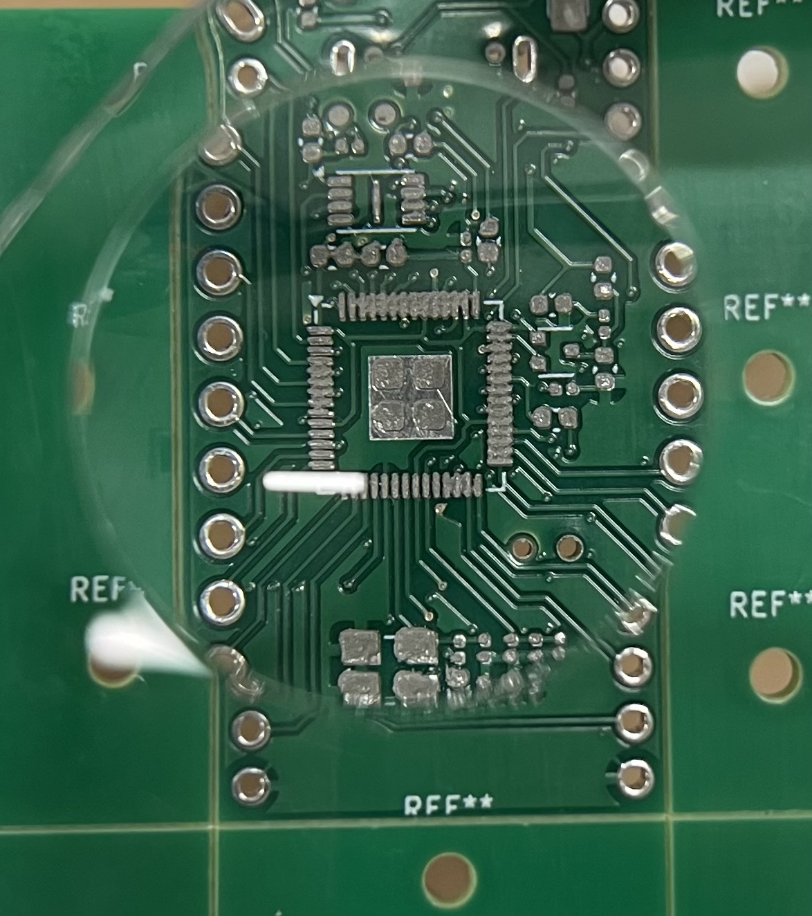ステンシルを使ってはんだペーストを印刷し、ピンセットで各部品を配置。その後ホットプレートでリフローを行うという工程で、初めてのSMD実装に挑戦しました。