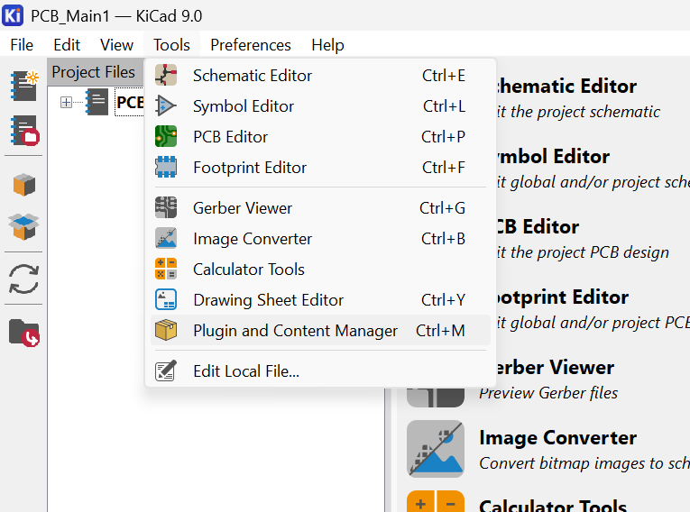 KiCadにJLCPCB発注用のプラグインをインストールします.KiCadを起動し,上のツールバーから”Tools” -> “Plugin and Content Manager”の順にクリックします(図1).