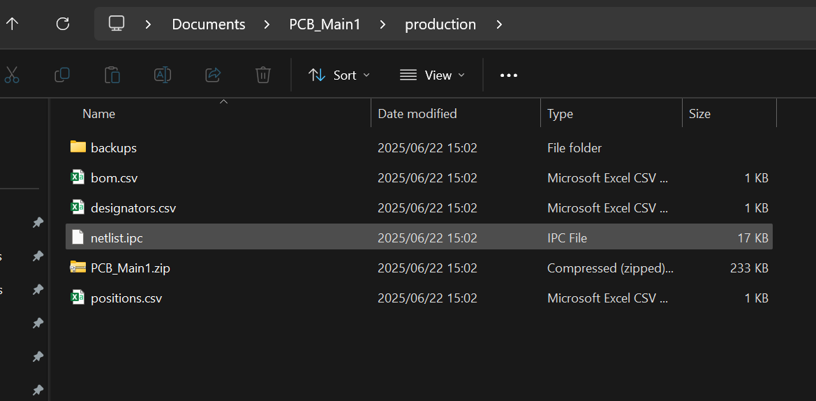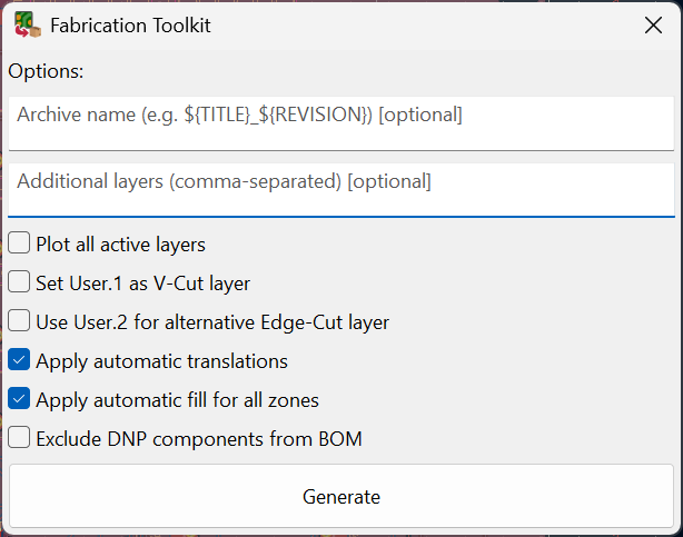 起動したら”Generate”をクリック.いろいろなオプションがありますが,基本的には初期設定のままで大丈夫です.クリックしたら基板データを保存しているフォルダ内に”production”というフォルダーが生成され,その中にガーバーデータ(ここでは”PCB_Main1.zip”)が保存されます(図7).これでガーバーデータの出力が完了しました.